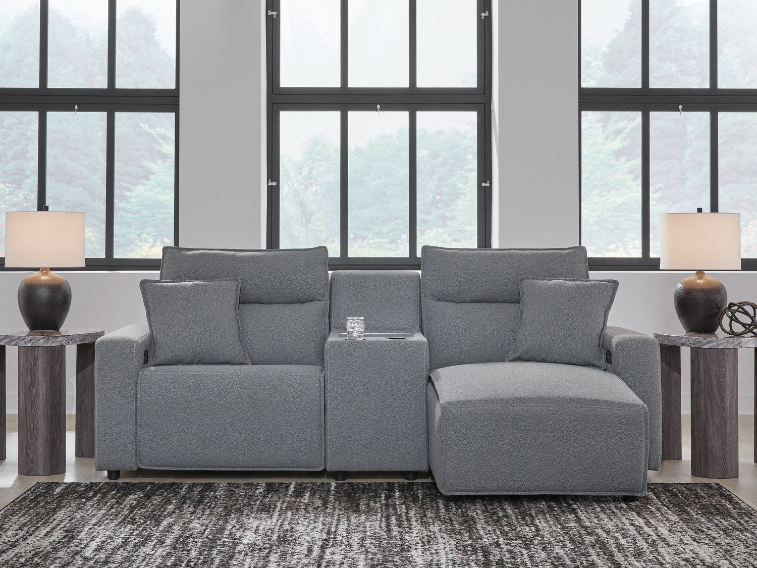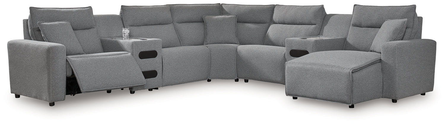 - Includes 6 modular pieces: left-arm facing power recliner, power armless recliner, armless chair, console, wedge and right-arm facing power recliner